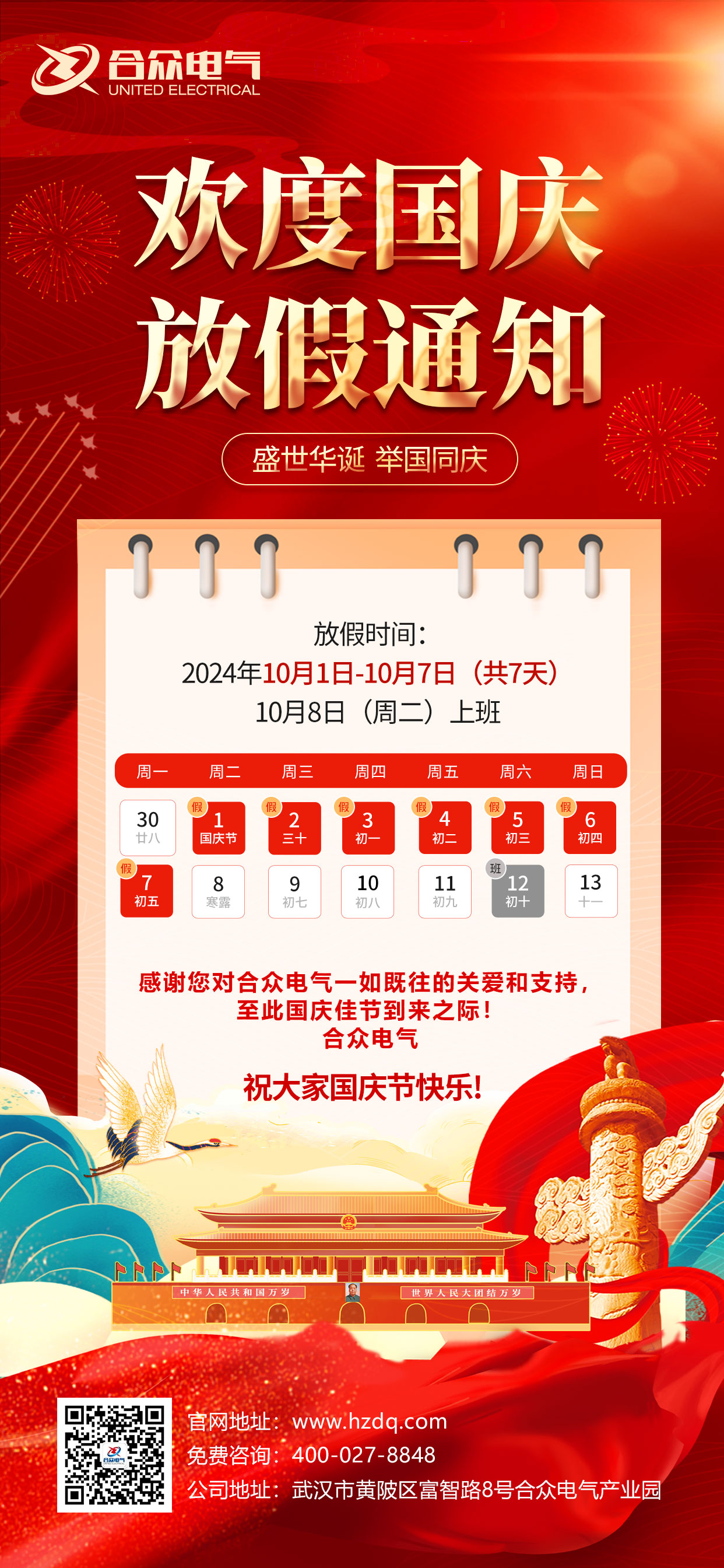 武漢市合眾電氣2024年國慶節放假通知