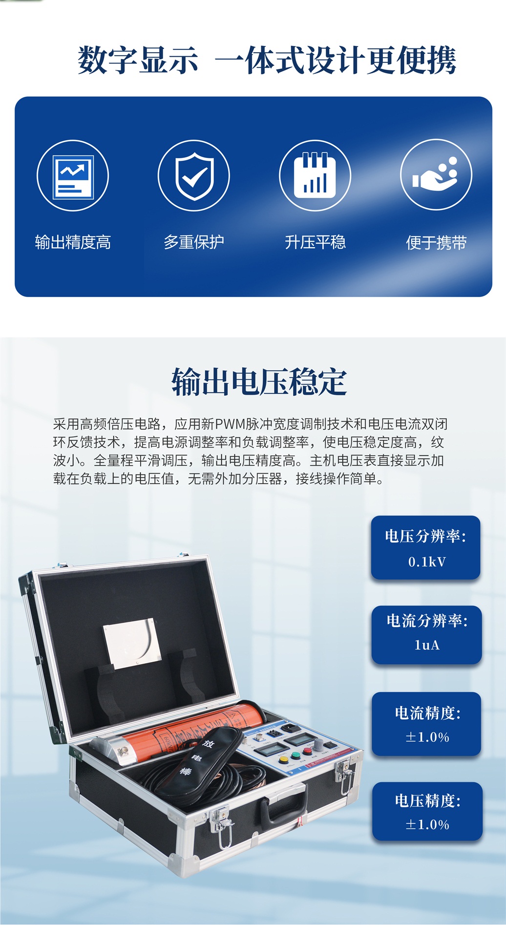 本儀器采用高頻倍壓電路,應用新PWM脈沖寬度調制技術和電壓電流雙閉環反饋技術,提高電源調整率和負載調整率,使電壓穩定度高,紋波小。使用進口大功率IGBT器件及其驅動技術,消除開關干擾,實現直流高壓發生器的高品質和便攜性。選用進口高頻高壓整流二極管,使倍壓筒更加小巧輕便,提升整機效率。根據EMI電磁干擾和EMC電磁兼容理論,采用屏蔽、隔離和接地等措施,提升整機安全性,并能承受額定電壓放電而不損壞。儀器保護功能齊全,具有零位保護、過壓保護、過流保護、擊穿保護,保護電路選用納秒級專用傳感器,動作迅速可靠,有效保障人身及設備安全。過壓整定選用數字撥碼開關,操作簡單并具有較高的整定精度。增設智能高精度0.75U功能按鈕,利于氧化鋅避雷器的測試。