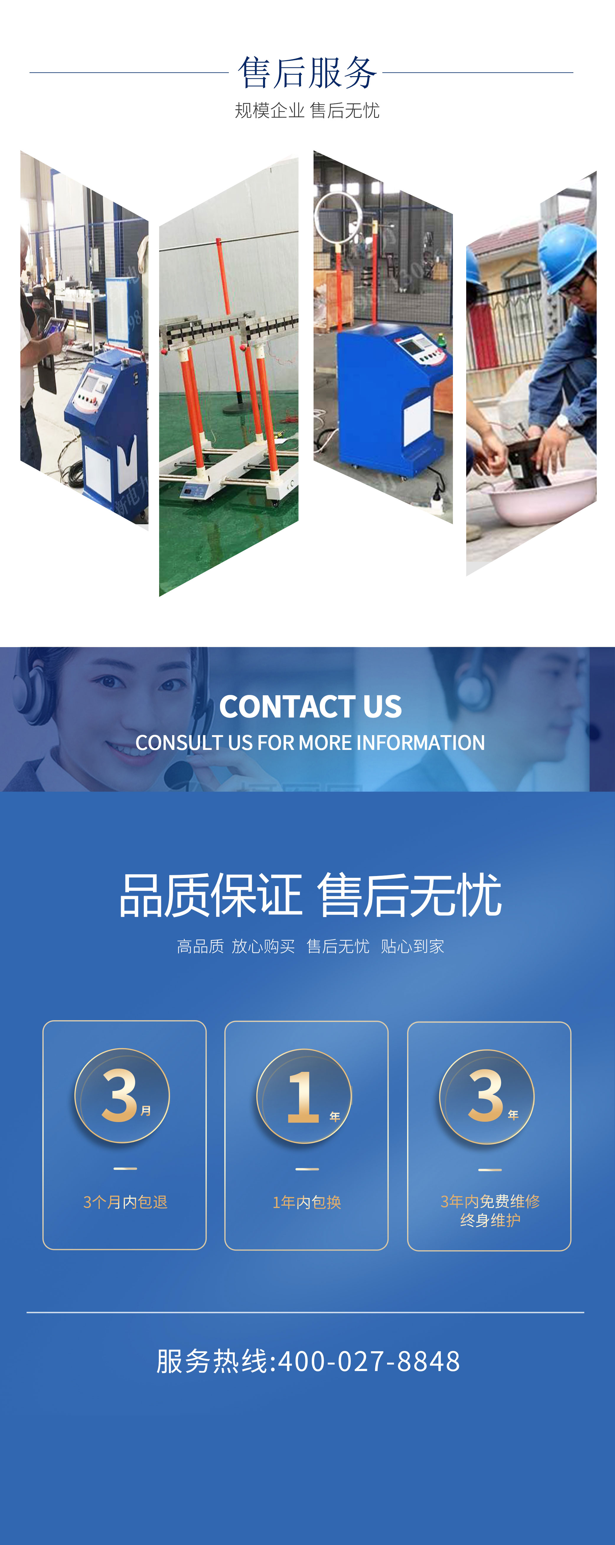 我們的售后服務承諾是:“3個月內(nèi)包退,1年內(nèi)包換、3年免費維修,終身維護”。在未來的日子里,我們將一如既往的堅持三類星級服務!