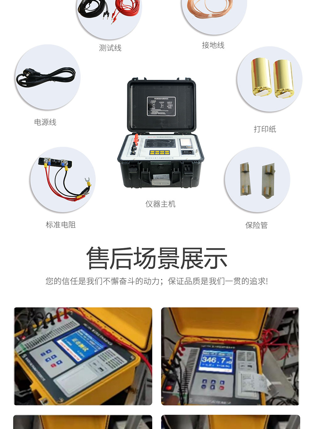 直流電阻的測量是變壓器、互感器、電抗器、電磁操作機構等感性線圈制造中半成品、成品出廠試驗、安裝、交接試驗及電力部門預防性試驗的必測項目,能有效發現感性線圈的選材、焊接、連接部位松動、缺股、斷線等制造缺陷和運行后存在的隱患。為了滿足感性線圈直流電阻快速測量的需要,我公司利用自身技術優勢研制了直流電阻測試儀。該儀器采用全新電源技術,具有體積小、重量輕、測試量程寬、抗干擾能力強、保護功能完善、大屏彩色液晶顯示等特點。整機由單片機控制,自動完成自檢、數據處理,具有自動放電和放電指示功能。儀器測試精度高,操作簡便,可實現直阻的快速測量。