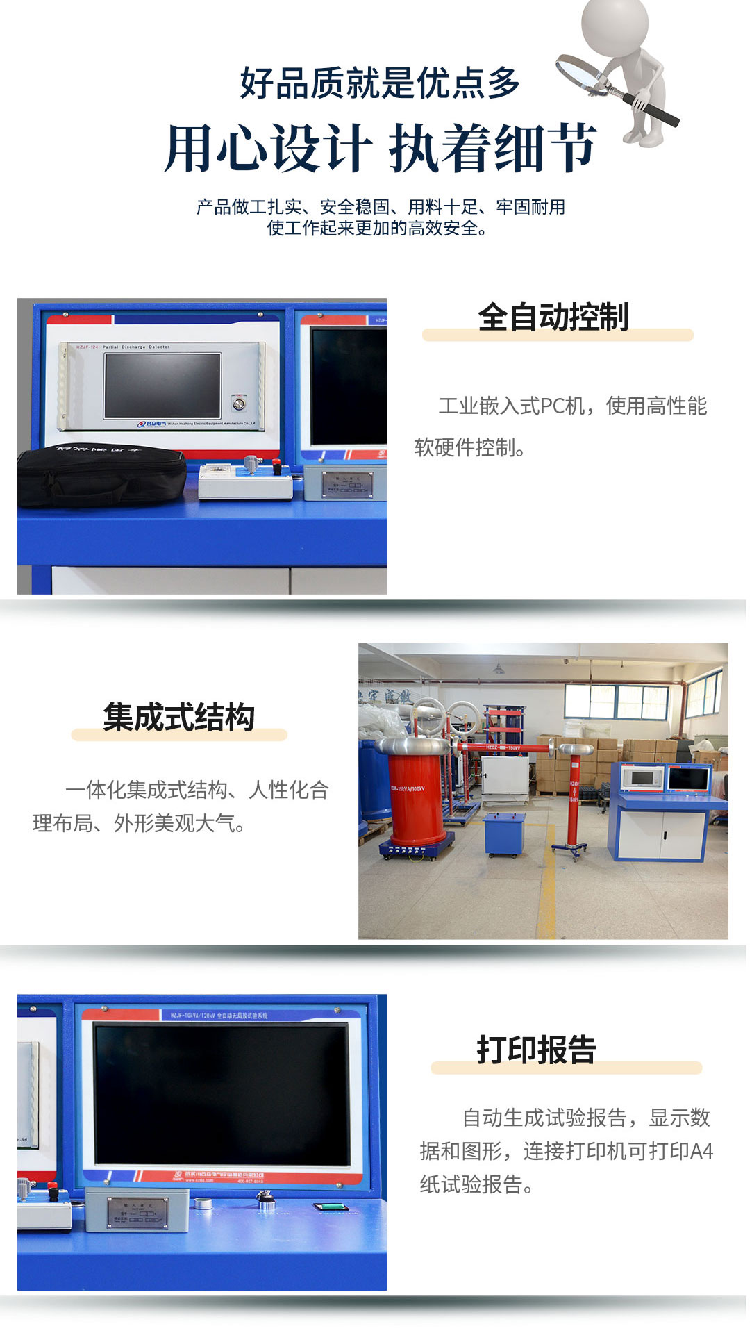該試驗裝置適用于供配電系統(tǒng),電力變壓器制造廠、工礦企業(yè)、科研部門等,對各種高壓電氣設備、電器元件、絕緣材料進行工頻或直流高壓下的絕緣強度試驗,是高壓試驗中不可少的重要設備。巧妙的將無局放試驗裝置(變壓器控制部分)和局部放電檢測儀結為一體,外觀亮麗輕巧,使測試過程更加方便簡單。