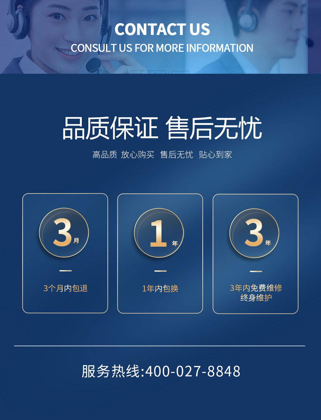 我們的售后服務承諾是:“3個月內包退,1年內包換、3年免費維修,終身維護”。在未來的日子里,我們將一如既往的堅持三類星級服務!