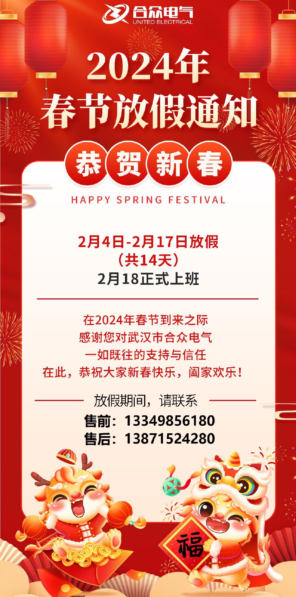 在此,我們也真誠地向長期以來所有關心和支持武漢市合眾電氣的新老朋友、廣大新老客戶獻上節日的祝福,祝大家新春快樂,闔家歡樂!